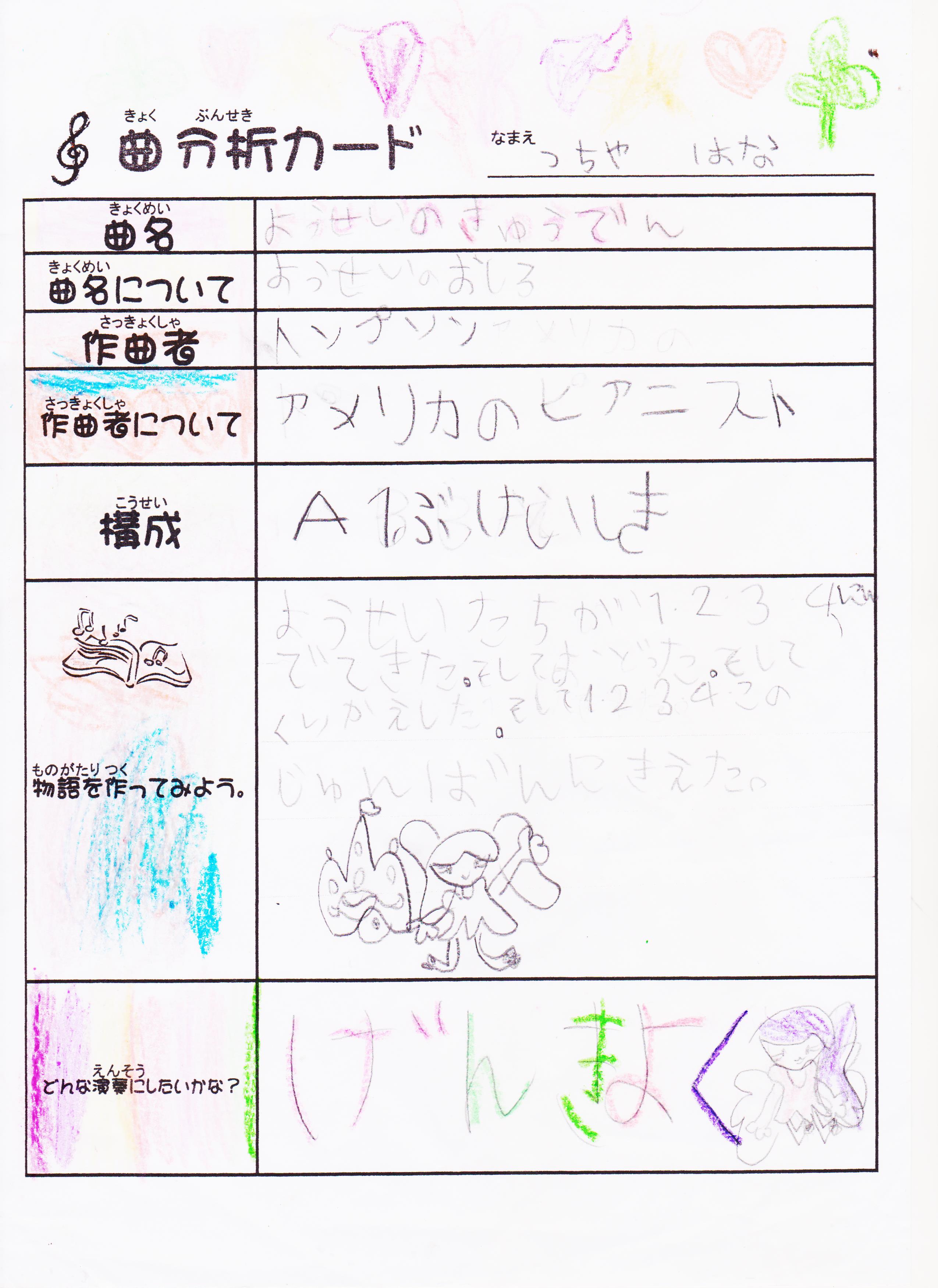 自分の曲を分析して発表した曲分析カード。