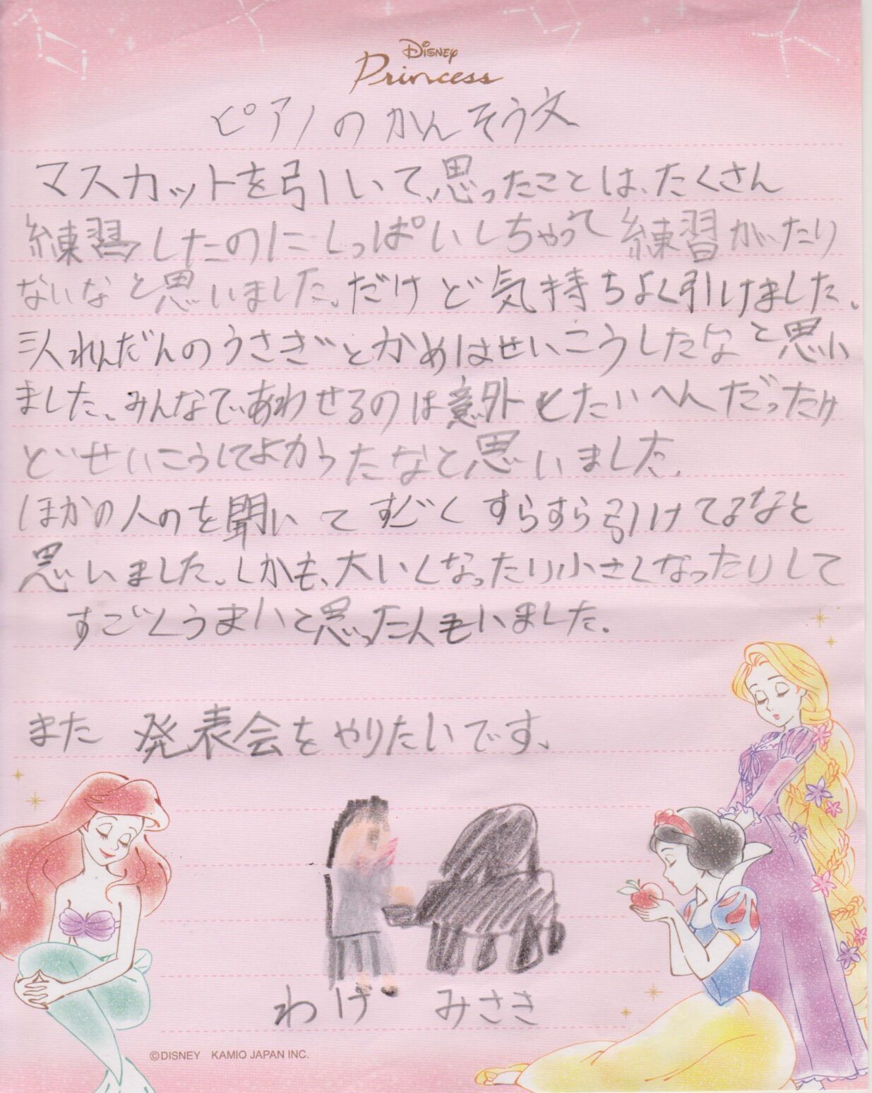 さやちゃん いい音でした 2021サマーコンサート 2021.07.242023.02.02 こんにちは。ゆめピアノ教室のいしごうおかです。 2021サマーコンサートを行いました さやちゃん(小2)のソロ 風になる 連弾 たからのダンジョン 感想カードです 風を感じました いい音でした。 いい曲でした シンプルですが、最高の誉め言葉ですね